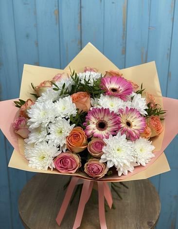 Букет, в котором идеально гармонируют мелкие цветочки хризантем, раскидистые герберы, альстромерии и крупные бутоны роз. Все компоненты ансамбля настолько четко и правильно подобраны, что от этого творения невозможно отвести взгляд. Такая очаровательная коробочка приведет в восторг близкого человека.